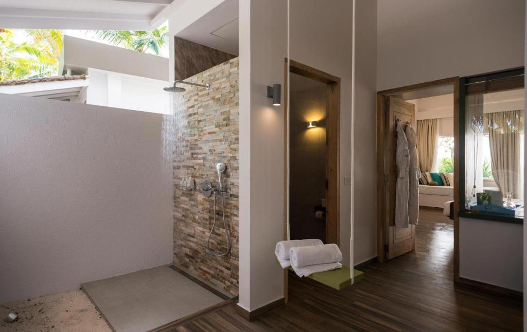All rooms are surrounded by green vegetation, clearly visible through the glass partitions that connect with the open-air bathrooms, which in itself creates a sense of connection with nature, in cool contrast with the expanse of the turquoise sea.