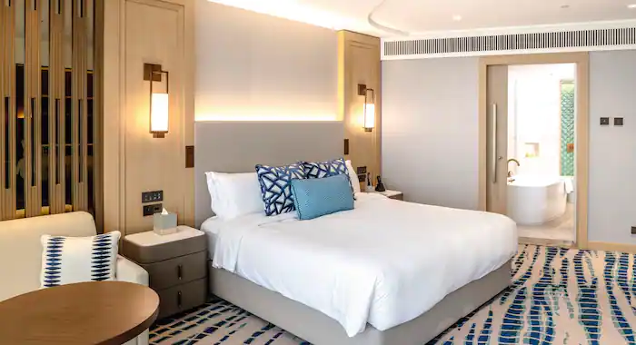 This hotel rolls out style in spades – its wave-like shape and blue-plated glass windows cut an iconic figure, and every room comes with a view of the Burj Al Arab. There’s been no holding back inside, either, with a 21-strong team of bars and restaurants and a world-class spa.