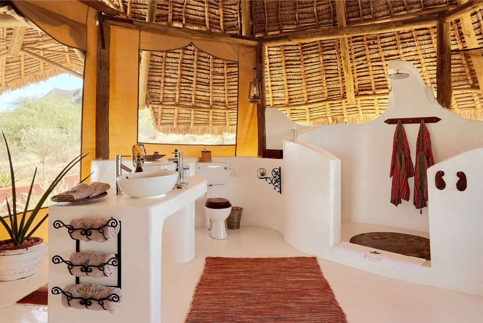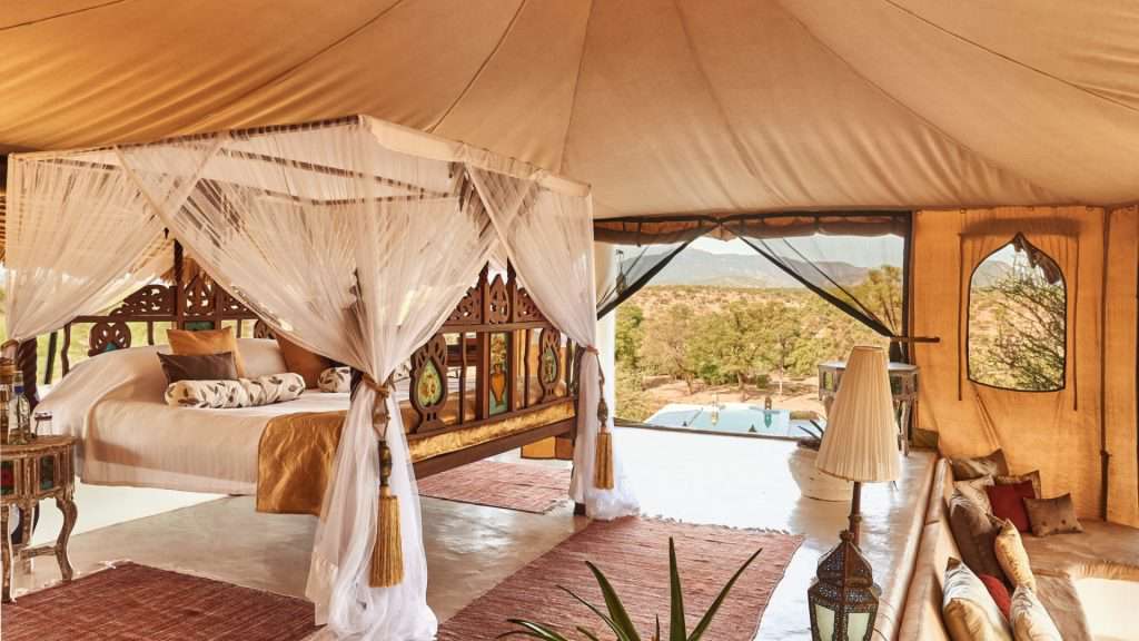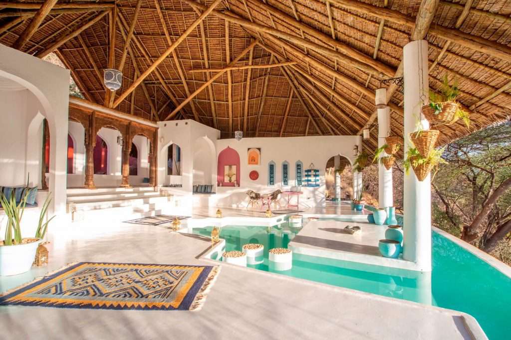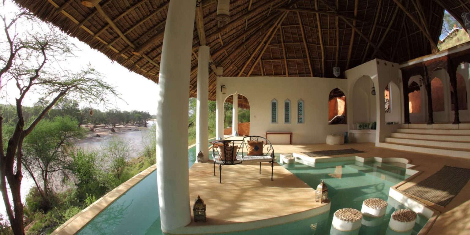 Perched on the edge of a river valley, the architecture of Sasaab blends Swahili and Moroccan design principals in which the African heat is of primary consideration. Each of the nine Moroccan-styled rooms is over 100m² with an enormous open-air bathroom and private plunge pool. From the veranda, guests can take in the remarkable views across the Laikipia Plateau toward the jagged peak of Mount Kenya. Its position on the river naturally facilitates watching the herds of elephant that come to bathe.