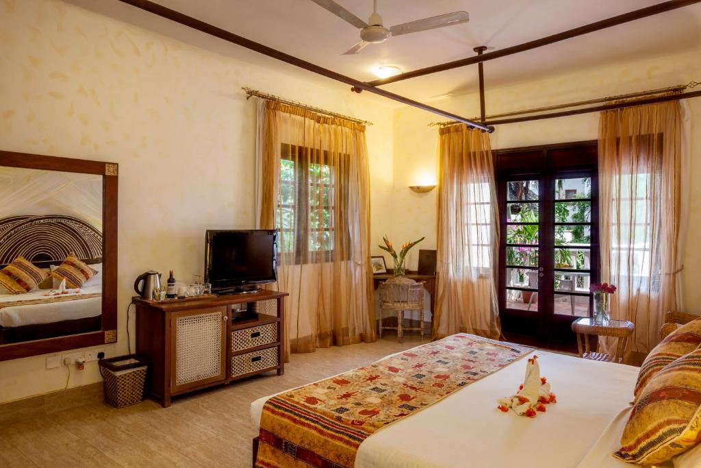 Guests can relax by the beach, pool or with a massage. There is also a shared lounge area, library and souvenir shop. The restaurant serves a range of Swahili, Indian, and Mediterranean cuisine.